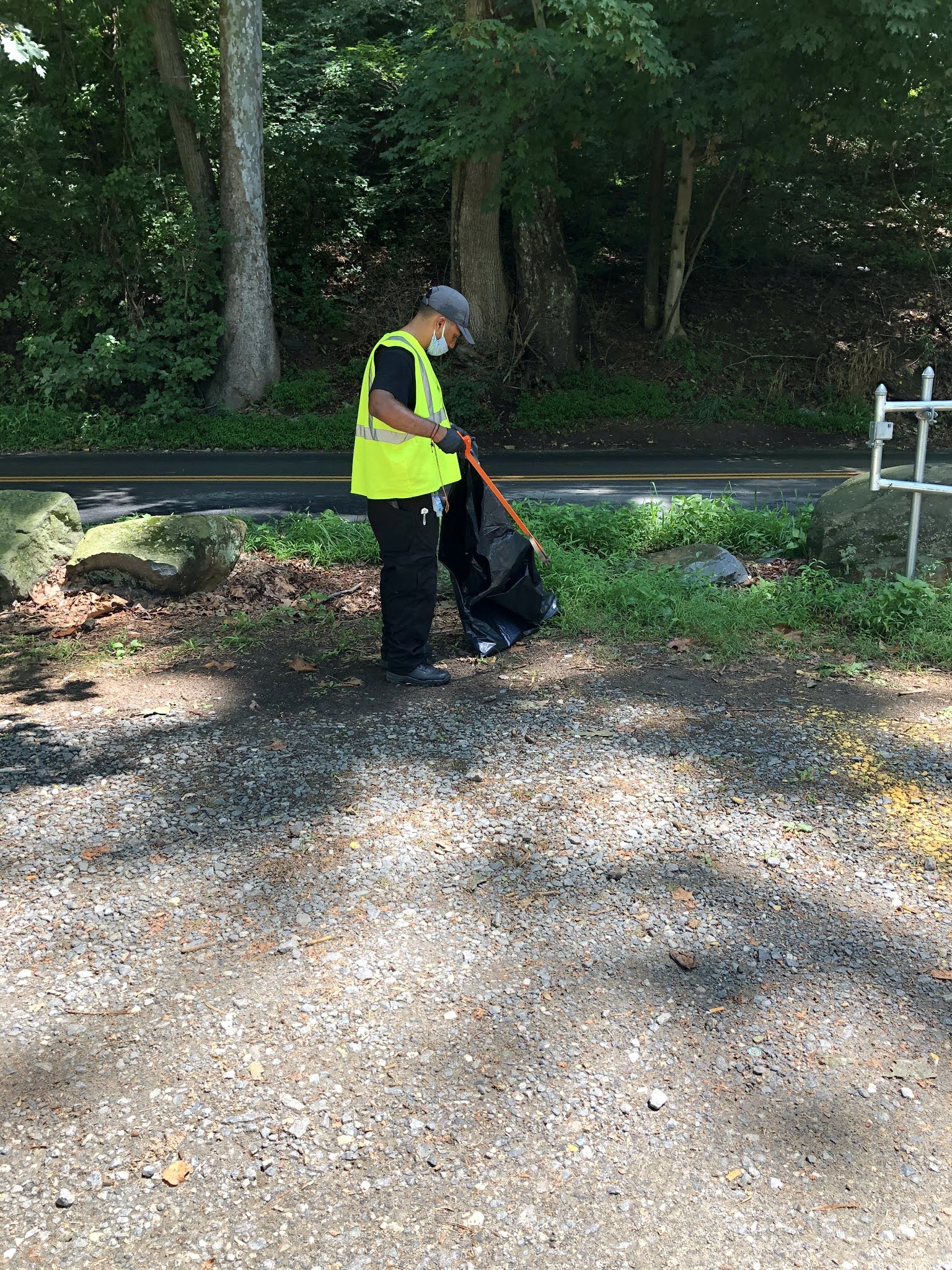This is a photo of me one-morning doing litter control. I have my mask, gloves, trash picker, and a trash bag (with two trash bags more in my back pockets). This is how I spent the majority of my morning working here at First State and I personally like doing this. I like knowing that I’m making a difference and cleaning up this parking lot from litter.