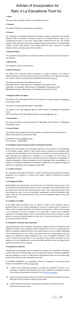 Founder and President, Ram Ji La Educational Trust Inc — advancing educational access in rural India (2025–Present)