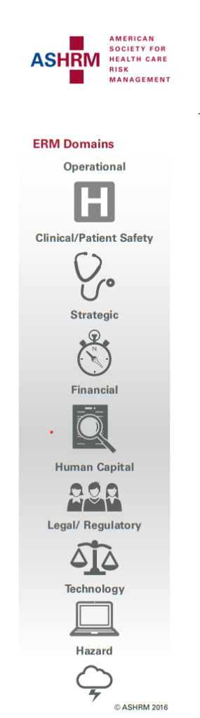 ASHRM designates eight domains of risk management to promote an ERM approach in healthcare. ASHRM Website