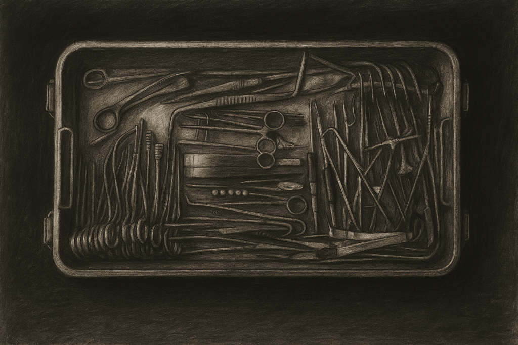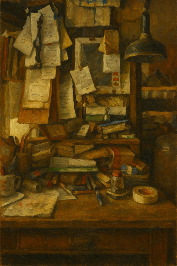 Desk in garage. Oil paint on canvas.