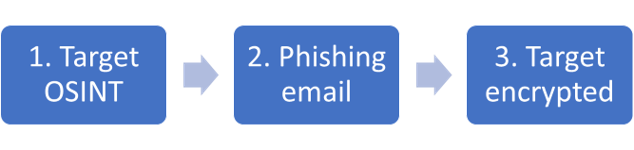 Ransomware groups have been known to use OSINT (financial statements, etc.) to set the ransom amount even before they launch their attacks [Stage 1, 2]. In fact, this amount is then demanded in the ransom note. It is also well known that many ransomware attacks use phishing emails as their initial attack vector [Stage 2, 3]. If someone within the target’s organization falls for the phishing email, then the target’s systems are encrypted.