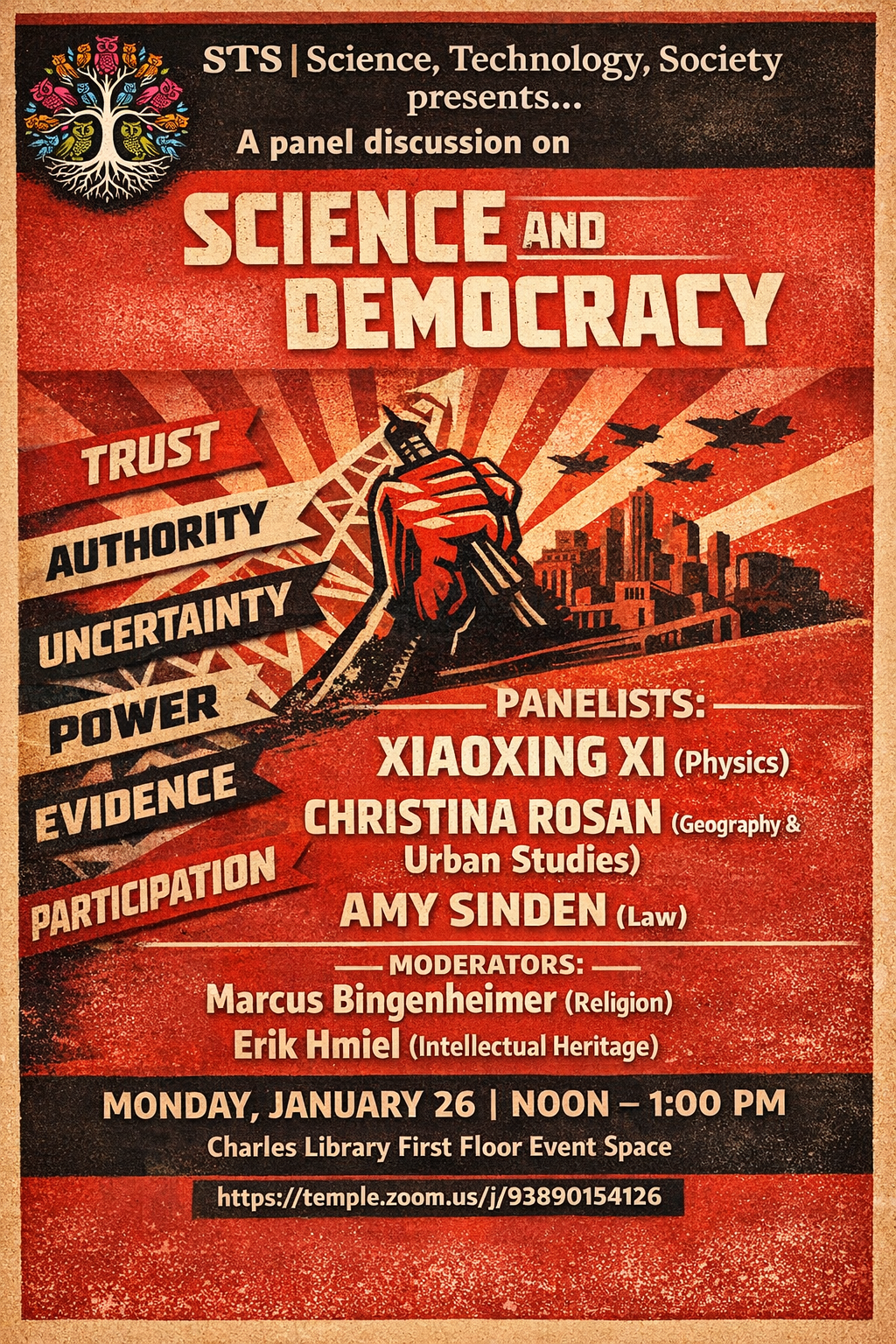 Science and Democracy (Panel Discussion). Panelists: Xiaoxing Xi (Physics), Christina Rosan (Geography & Urban Studies), Amy Sinden (Law); Moderators: Marcus Bingenheimer (Religion), Erik Hmiel (Intellectual Heritage)