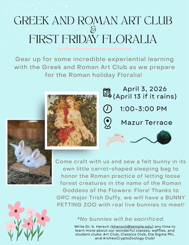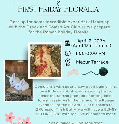 Gear up for some incredible experiential learning with the Greek and Roman Art Club as we prepare for the Roman holiday Floralia! April 3, 2026 (April 13 if it rains) 1:00 – 3:00 PM Mazur Terrace Come craft with us and sew a felt bunny in its own little carrot-shaped sleeping bag to honor the…