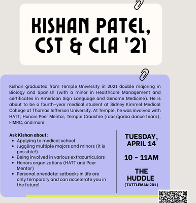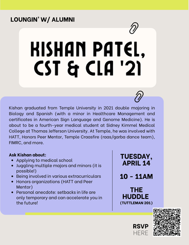 Tuesday, April 14 10 – 11am The Huddle (Tuttleman 201) 🍕 with pizza for (early) lunch! Kishan graduated from Temple University in 2021 double majoring in Biology and Spanish (with a minor in Healthcare Management and certificates in American Sign Language and Genome Medicine). He is about to be a fourth-year medical student at Sidney Kimmel Medical…