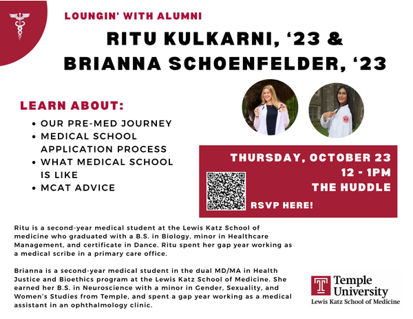 | Thursday, October 2312-2pm (we’ll have pizza for lunch!) The Huddle (Tuttleman 201) Learn about: 🏥 Our pre-med journey 🏥 Medical school application process 🏥 What medical school is like 🏥 MCAT advice Ritu is a second-year medical student at the Lewis Katz School of medicine who graduated with a B.S. in Biology, minor in Healthcare Management, and certificate in Dance. Brianna is a second-year medical student in the dual MD/MA in Health Justice and Bioethics program at the Lewis Katz School of Medicine. |