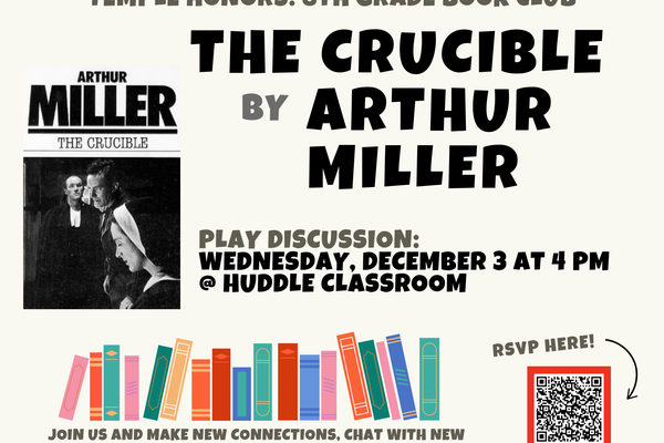 Join us for the November/December 8th Grade Book Club pick: The Crucible! Temple Honors 8th Grade Book ClubWednesday, December 34 – 5pmHuddle large classroomwith pizza! Check out a copy of The Crucible from the library or stop by Honors to borrow a copy! RSVP at the link below. Click here to RSVP for Book Club!