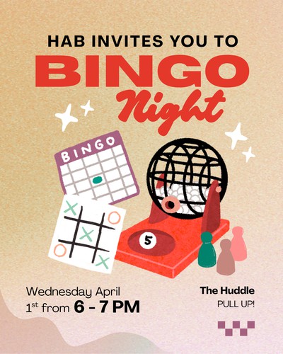 EventsResearchHAB: Bingo Night! 4/1 Dev Patel2 weeks ago01 mins Join HAB on Wednesday, April 1st in the Huddle for a night of Bingo fun! Post navigation Previous: HBSA – Study Day 4/2Next: First-Gen Honors: GBM #4 Leave a Reply Cancel replyYou must be logged in to post a comment.