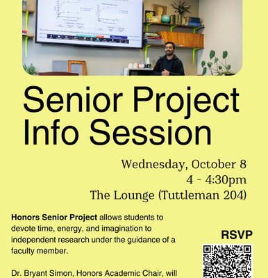⭐ Wednesday, October 8 ⭐ 4 – 4:30pm ⭐ The Lounge (Tuttleman 204) Honors Senior Project allows students to devote time, energy, and imagination to independent research under the guidance of a faculty member. Dr. Bryant Simon, Honors Academic Chair, will talk about Senior Project basics, course requirements, and answer any questions!