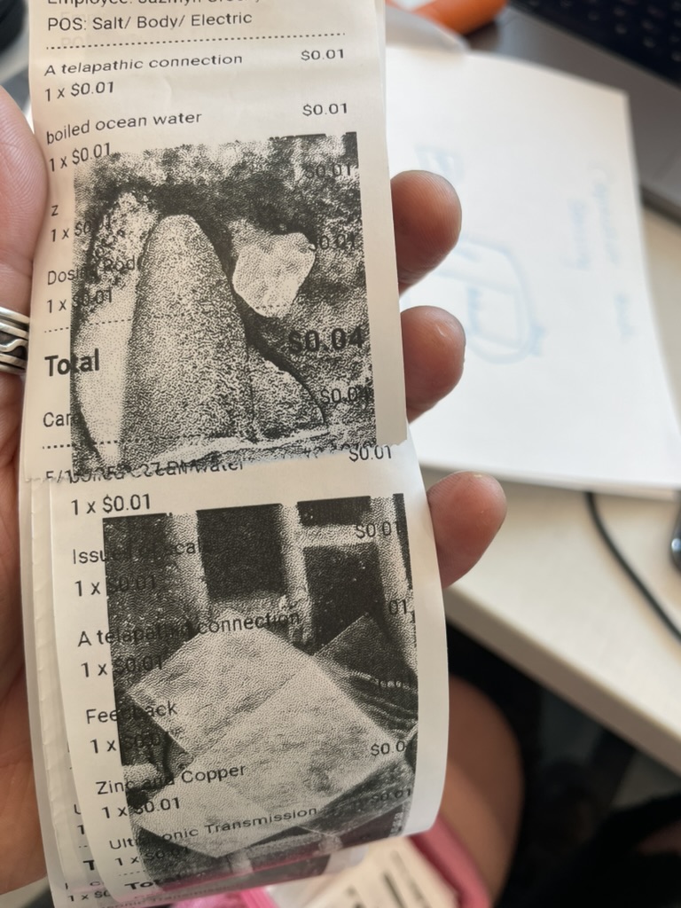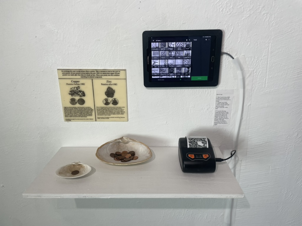 Another work I was developing involved thermal printers and a point-of-sale system. I like that thermal printing uses heat, not ink, to transfer information. A receipt is essentially a contract that produces an interaction and exchange. With the technical support at the Makerspace, I was able to develop this work, which offered alternative systems of value. I was struck by how the language of electricity overlaps with commerce: charge, current, exchange, net, wire. The sales screen offered the purchase of intangible things like a “connection,” “longing,”or “networks.” Each receipt acts as both a contract and a point of contact. In exchange for a receipt, participants were asked to trade a penny, sorting it into mineral components, copper or zinc based on the year it was minted. As pennies become obsolete, this work reflects on systems of exchange, the lucky penny, value, and contract, using preloaded thermal paper to print images that play with chance and legibility.