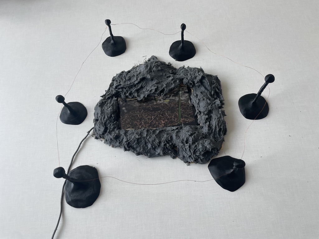 I also developed this work imagining a telepathic connection with ants, tuning into a sense of communion with the interior of an anthill. It asks how we might build empathy for life forms radically different from our own. The work included a video built into a mound of salt dough and surrounded by stanchions 3D-printed at the Makerspace. Ants respond to heat through their thermal bodies, navigating the world through gradients of temperature and touch. Grain by grain, they move earth and build mountains, shaping complex worlds beneath our feet. In the face of climate catastrophe, the piece explores how attuning to such sensory logics might expand empathy in a more-than-human world.