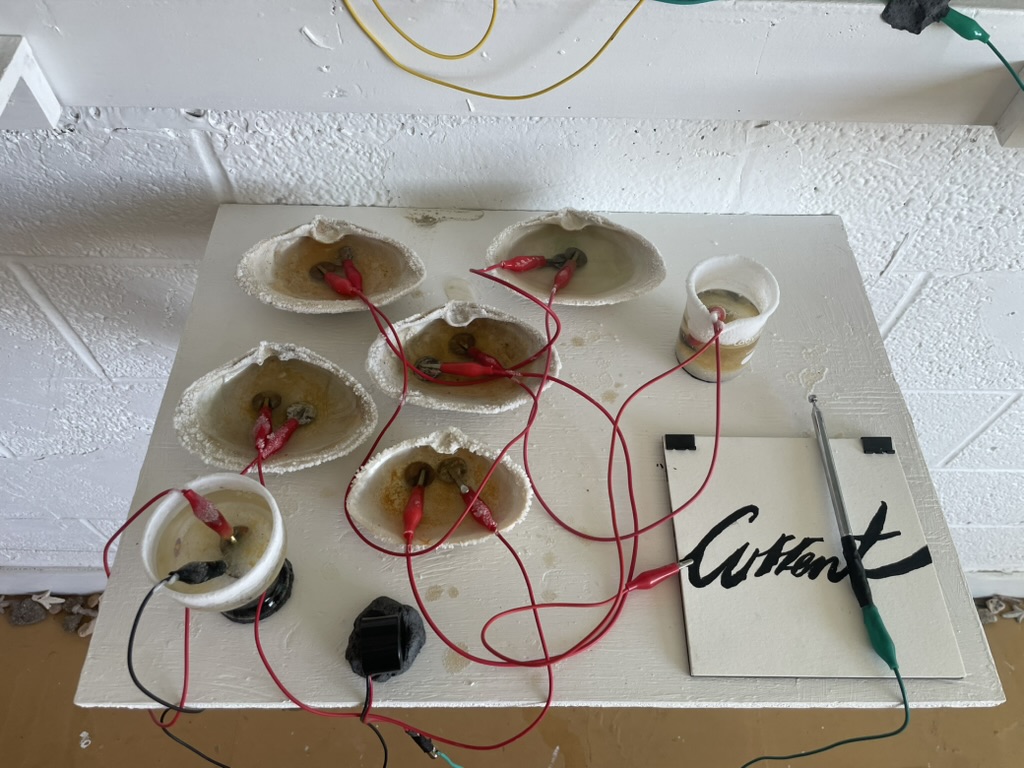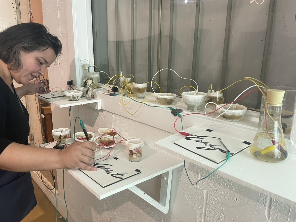 My research at the Makerspace helped me to further develop my technical understanding of the fundamentals of naturally occurring electricity, particularly in understanding capacitive electric exchange and salt water circuitry. For the past several years, I have been collecting ocean water and boiling it until it becomes salt. There is something impossibly essential about salt. Salt is in the blood, it is electric, a transmitter between cells, critical for maintaining a heartbeat. Salt is a crystal associated with energy healing. Ocean salt water is one of the major ways in which microplastics are consumed by humans and has a direct relationship to a world affected by climate change. The project speculates on climate change resilience by embracing salvage economies and the precarity of our contemporary electric world.