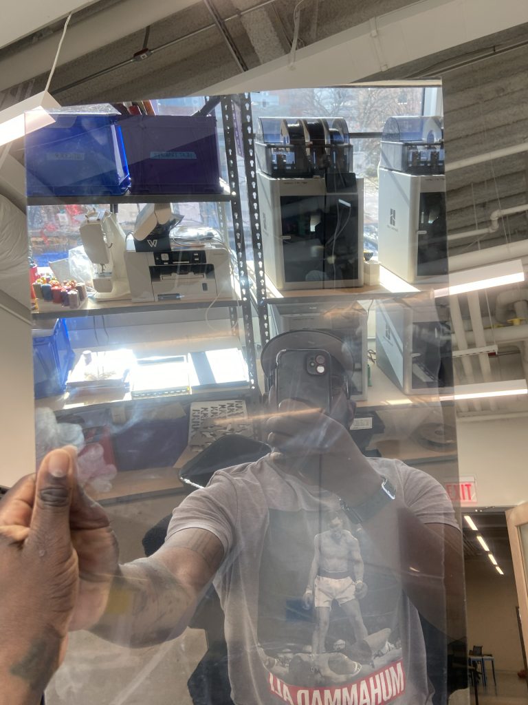 During my Makerspace residency, I began a new work titled Sound System. Sound System is a multimodal experience using sound, light, and image to create an embodied experience of looking, seeing, and hearing. The goal with the Sound System is to create a 3-way speaker system that also functions as viewfinders into a visual field. The project is a continuation of my thesis work at Tyler (MFA ‘24). The project is rooted in an attempt to highlight diasporic exchanges through advancements in sound technologies. As a lens-based artist, a lot of my work relies on images and photographic processes to convey a concept. For the sound system, I wanted to merge an audiovisual experience within a contained space, the speaker cabinet. Within this space the goal is to create an experience that rewards and stimulates looking.