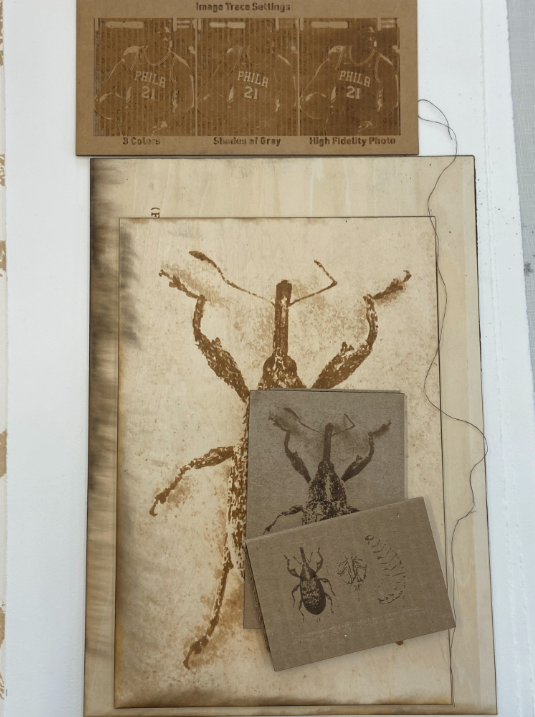 A large part of the experience for me was gaining access to a digital fabrication space. I spent time getting familiar with the laser printer, materials, and tools in the Makerspace. With the laser printer I created a series of prints based on a historical drawing of a boll weevil. The boll weevil is a cotton-eating beetle that led to the devastation of crops in the early 20th century, which became a large contributing factor to the Great Migration of Black Southern sharecroppers to the northern United States.