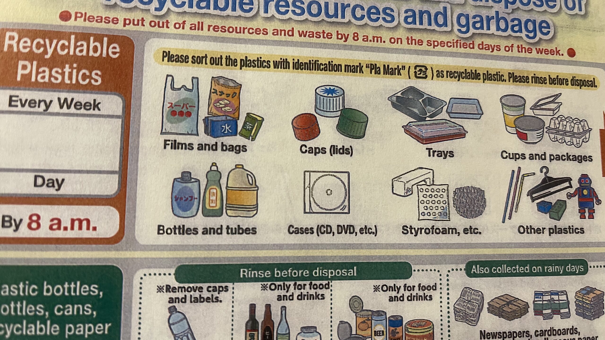 - The Japanese are fastidious about recycling–it puts Americans to shame. There is a 32-page booklet that I was given when I arrived in my apartment here that explains the proper procedures for sorting out recyclables from other waste… and people do it. It makes me feel ashamed that most of the time I can’t be bothered to even put bottles in a separate container at home.