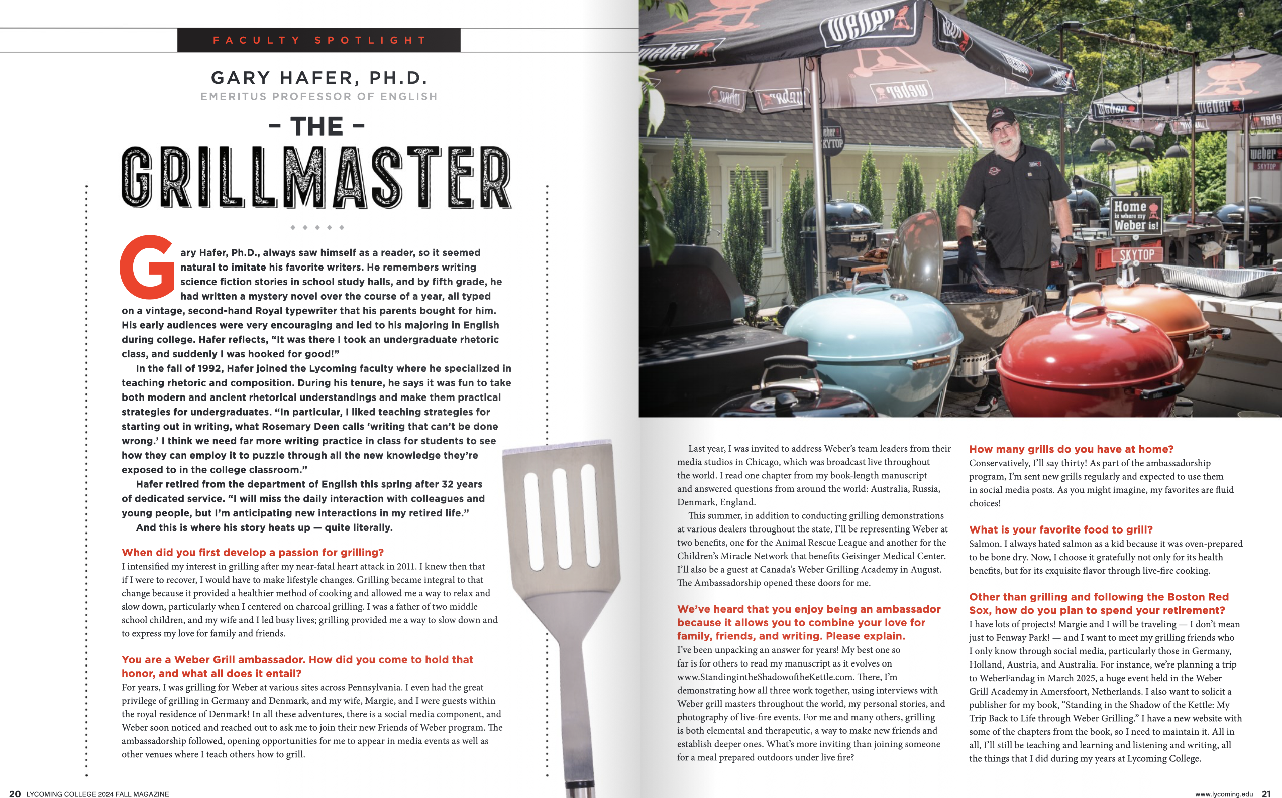 Gary R. Hafer was born in Reading, Pennsylvania, in 1957. A son to Virginia Martha Hafer and Richard Peter Hafer. Virginia Hafer was a seamstress at Berkshire Knitting Mill, and Richard Hafer was a machinist for Berks Engineering. As a teenager, Gary was active in his school’s HAM radio program and later convinced his father to buy their own set. After convincing his father, they both became amateur HAM radio operators and connected with people across the country and the world. Gary was also an avid bowler with his father and would compete in bowling leagues together. After graduating from Reading high school in 1975, Gary was admitted to Kutztown University and worked as a McDonald’s line cook on weekends. In 1980, Gary graduated from Kutztown with a B.A in English. He then continued to work at McDonalds for another two years as an assistant store manager before attending Purdue University to pursue a PhD in English and Rhetoric from 1982 to 1987. After graduating, Gary became an adjunct professor at West Chester University and worked for the seminary as a groundsman. In 1990, he met his future wife, Marjorie Maddox, at an English Professor’s conference in Erie, Pennsylvania. In 1992, Gary was offered an assistant professorship at Lycoming College in Williamsport, PA. Two years later, Gary married Marjorie Maddox, then assistant professor of English and Creative writing at neighboring Lock Haven University, and moved into their new home in Williamsport, Pennsylvania, in 1995. In 1997, they had a daughter and a son in 1999. Gary became a full professor in 2002 at Lycoming College. In 2010, Gary suffered a life-threatening heart attack but rapidly recovered. This near-death experience shaped his outlook for the rest of his life and bolstered his passion for grilling and community outreach. Since 2010, Gary has been most known in his community as a grilling guru and advocate for healthier eating. He has hosted grilling demonstrations at hundreds of colleges, private businesses, and grilling events across Pennsylvania. Gary Hafer retired from Lycoming college in 2024 after 32 years. Gary’s appetite for learning has not diminished however and still remains an avid reader in many fields, especially history. Gary’s own life story intersected with many important global historical events, such as Kennedy’s Assassination, Watergate, the Iran-Contra affair, the fall of the Berlin Wall and the Soviet Union, and 9/11. Most memorable to him was the fall of the Berlin Wall in 1989. Gary still remembers talking to West Germans about the wall on his HAM radio in the late 1960s, when he was only a teenager.