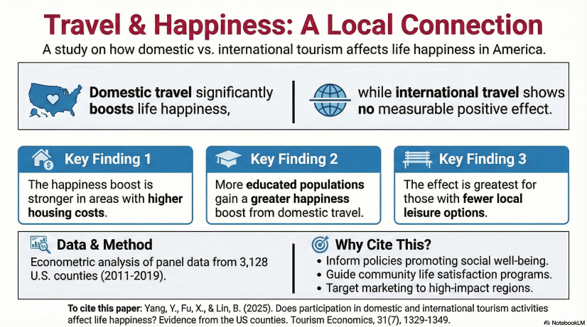 This study investigates the influence of domestic and international tourism participation on life happiness over an extended period. Employing a panel dataset encompassing 3,128 U.S. counties from 2011 to 2019, we conduct an econometric analysis to elucidate this impact and explore moderating factors. The findings reveal that domestic tourism participation significantly enhances residents’ life happiness, while international tourism participation exhibits statistical insignificance. Furthermore, housing costs, educational attainment, and leisure participation emerge as moderators influencing this effect. Notably, the impact of domestic tourism participation is more pronounced in counties with higher housing costs, elevated educational attainment, and lower leisure participation rates. Our results are substantiated through various robustness checks, reinforcing their general validity. Lastly, we discuss the implications of these findings.