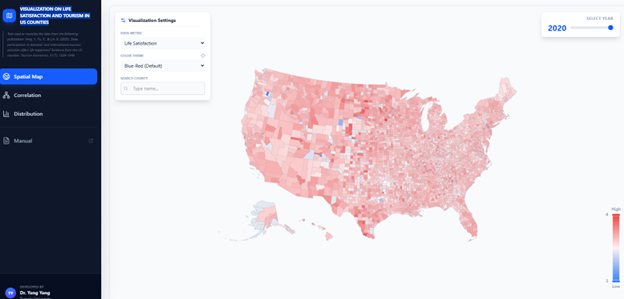 This web-based application is designed to visualize the longitudinal spatial-temporal relationship between resident life happiness and tourism participation across the United States. It is built upon the empirical research of Yang, Fu, and Lin (2025), which utilized a panel dataset covering over 3,000 U.S. counties to examine how domestic and international tourism activities influence subjective well-being.